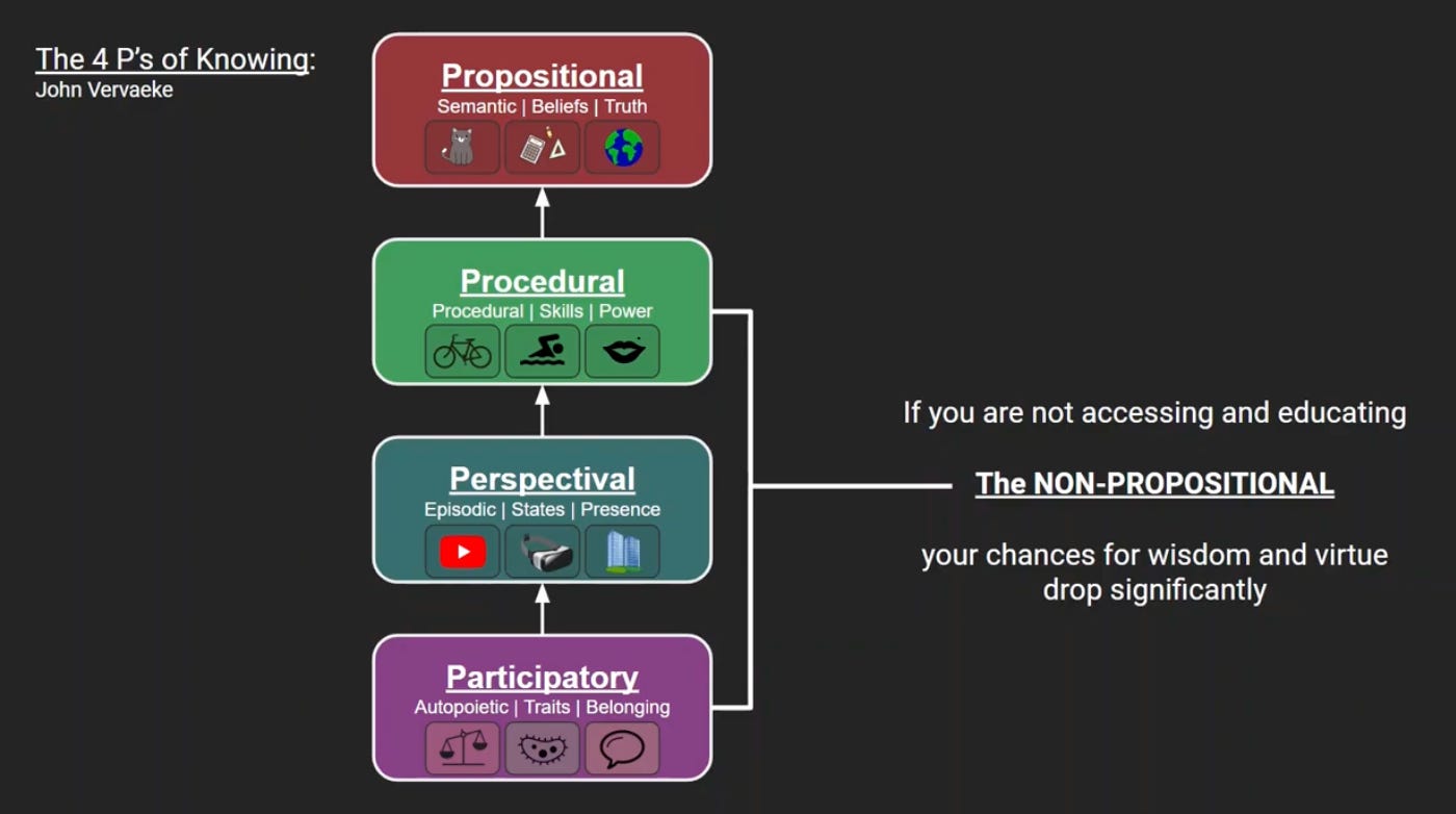 This ladder of knowing doesn’t purport to rank the types of knowing, but they are useful for different situations. Knowing that is extremely useful for the material world. As is knowing how to. Knowing what it’s like to begins to shift towards the relational. And knowing through being even more so.